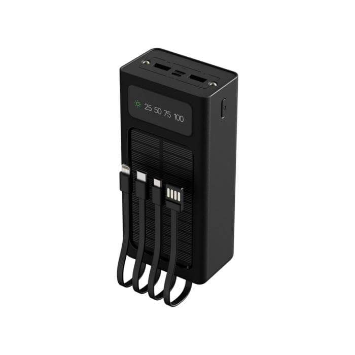 Especificaciones TĂ©cnicas: BaterĂa de alta capacidad (30,000mAh): Carga completamente tu smartphone varias veces. InformaciĂłn general Tipo de producto: Banco de energĂa con panel solar. Capacidad de la baterĂa: 30,000mAh/3.7V/111Wh. Entrada Micro-USB DC: 5V/2A USB-C® DC: 5V/2.7A USB-A DC: 5V/2A Panel solar: 80-100mA Tiempo de carga con entrada Micro-USB: 11.5 h Tiempo de carga con entrada USB-C®: 11.5 h Tiempo de carga con entrada USB-A: 11.5 h Tiempo de carga con entrada de panel solar: Aproximadamente 300 horas de luz diurna con sol* Salida NĂşmero de salidas de carga: 6 salidas: puertos USB-A (x 2) | puerto USB-C® bidireccional (entrada y salida) | cables de carga Micro-USB | Lightning® y USB-C® integrados USB-A (2 salidas) DC: 5V/3A (15W máx.) Salida USB-C®/Micro-USB/Lightning® DC: 5V/3A (15W máx.) CaracterĂsticas fĂsicas CaracterĂsticas especiales: Linterna LED | Interruptor de encendido | Indicador LED de nivel de baterĂa Material de la carcasa: ABS Color: Negro Tipo y longitud del cable de carga: Cable USB-A a USB Tipo-C® 3A de 30 cm de largo Dimensiones: 14,9 x 7 x 4,2 cm Peso: 613 g